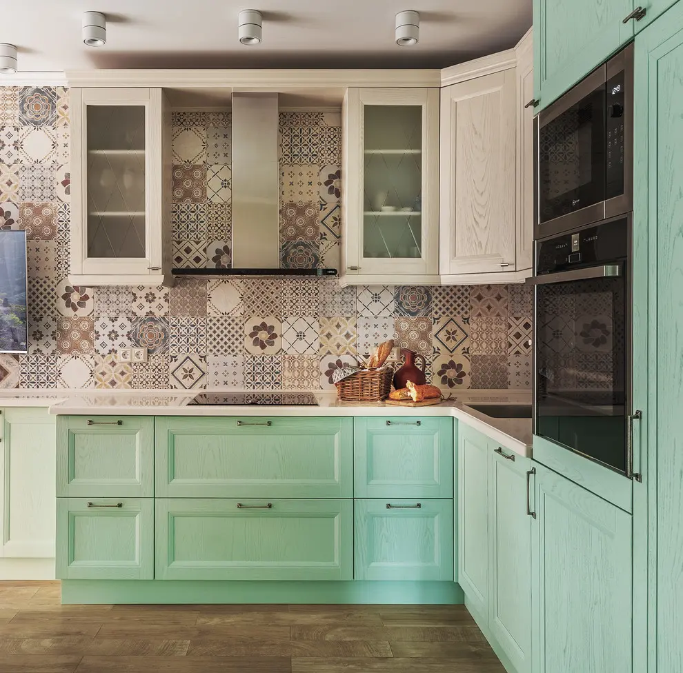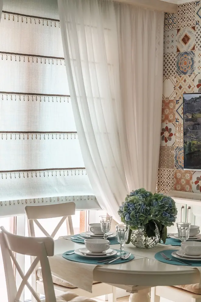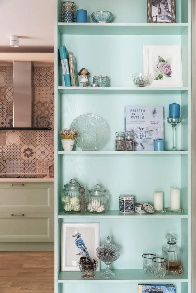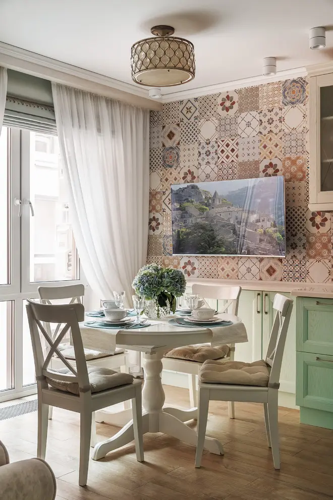 Coloristica se compune din pasteluri pe baza de roz, verde, albastru, galben si beige. In cazul bucatariei, acestea se intalnesc intr-un cadru retro conturat cu ajutorul design-ului mobilierului si patternului placilor de faianta care despart corpurile superioare de blat. Tot un aer vintage transmit si perdelele, zona de servire a mesei si corpurile de iluminat artificial iar intreaga organizare a spatiului face ca bucataria sa fie potrivita pentru un cadru de familie.