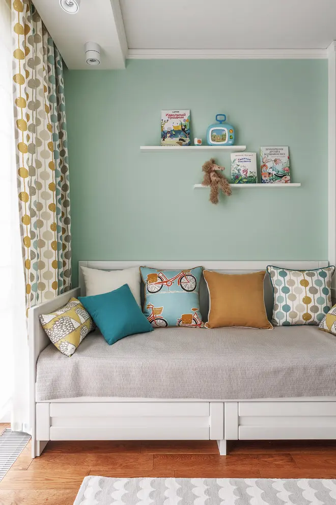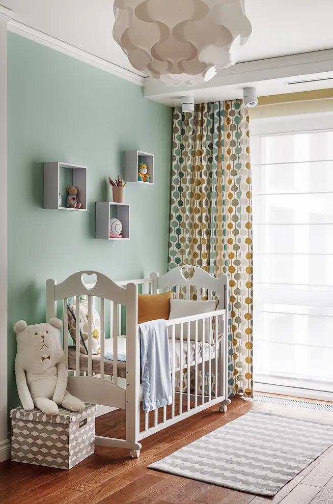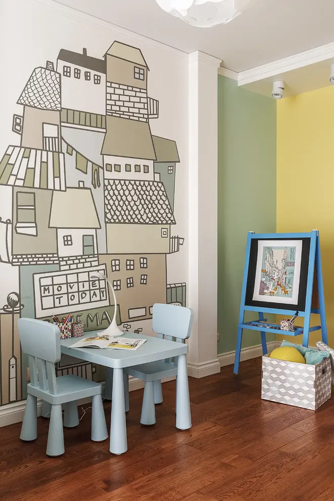 Plina de lumina si culoare, asa se exprima camera celui mai mic membru al familiei. Intr-o maniera minimalista si moderna, se aseaza un mobilier functional si practic, servind la asigurarea confortului atat in cazul unei varste fragede, cat si in perioada cresterii. Acesta se compune dintr-un patut pentru nou nascuti, o canapea, o masuta si doua scaune pentru copii. Culorile folosite mural si textil insenineaza camera, iar patternul draperiei si accesoriilor, impreuna cu picturile murale jucause, emana inocenta si voiosie, incarcand energetic intregul spatiu pus la dispozitie.