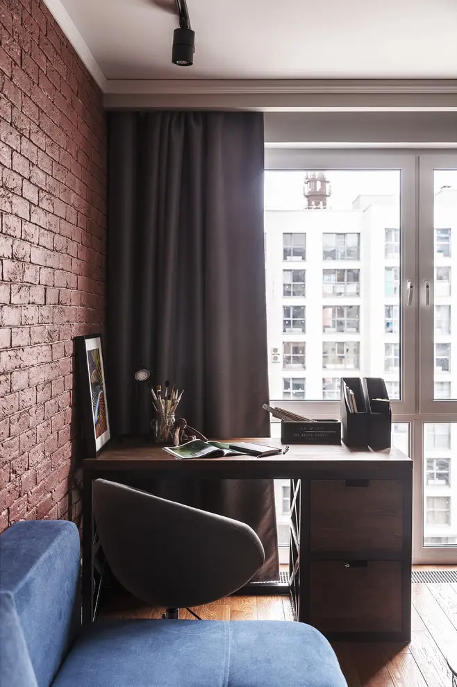 Camera cea mai artistica a intregii amenajari este cel de al doilea dormitor, dedicat adolescentului familiei, o camera care prin compozitia sa, nu face altceva decat sa vorbeasca in numele posesorului, caracterizandu-l in ce mai detaliat mod. Canapeaua si zona biroului se completeaza perfect cu accesoriile abstracte si culorile vii cu care sunt pictate manual. Aspectul de caramida al peretelui si draperia in culori inchise nu fac altceva decat sa inchida atmosfera si sa o transforme intr-o zona perfecta pentru inspiratie si dezvoltarea creatiei.