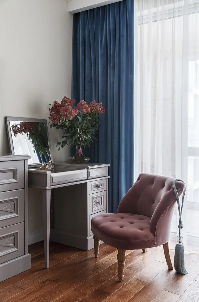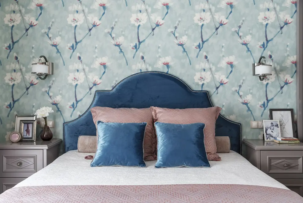 Pentru ca vorbim de o familie numeroasa, planul initial al apartamentului cu trei camere se modifica usor, living-ul devenind dormitor matrimonial, iar dormitoarele dedicate membrilor mici ai familiei. Cadrul natural este foarte evident conturat in cazul acestei camere prin folosirea unui tapet inflorat ce ilustreaza frumusetea ciresilor in plina primavara. Albastrul evidentiat cu ajutorul catifelei impreuna cu accentele de roz pal, transforma incaperea intr-un spatiu intim si delicat, perfect pentru relaxare.