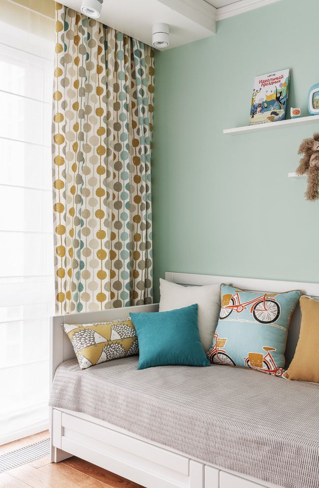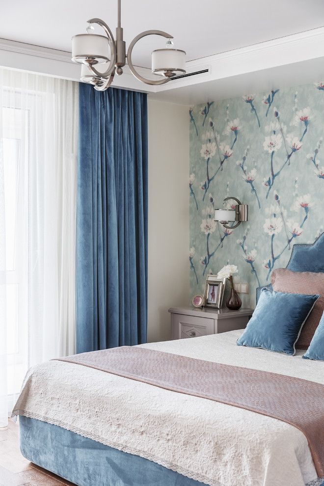 Pentru ca vorbim de o familie numeroasa, planul initial al apartamentului cu trei camere se modifica usor, living-ul devenind dormitor matrimonial, iar dormitoarele dedicate membrilor mici ai familiei. Cadrul natural este foarte evident conturat in cazul acestei camere prin folosirea unui tapet inflorat ce ilustreaza frumusetea ciresilor in plina primavara. Albastrul evidentiat cu ajutorul catifelei impreuna cu accentele de roz pal, transforma incaperea intr-un spatiu intim si delicat, perfect pentru relaxare.