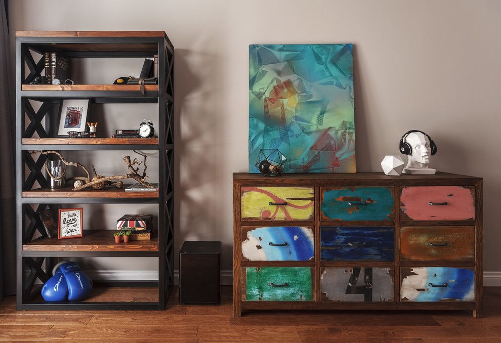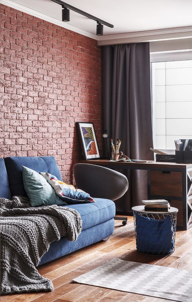 Camera cea mai artistica a intregii amenajari este cel de al doilea dormitor, dedicat adolescentului familiei, o camera care prin compozitia sa, nu face altceva decat sa vorbeasca in numele posesorului, caracterizandu-l in ce mai detaliat mod. Canapeaua si zona biroului se completeaza perfect cu accesoriile abstracte si culorile vii cu care sunt pictate manual. Aspectul de caramida al peretelui si draperia in culori inchise nu fac altceva decat sa inchida atmosfera si sa o transforme intr-o zona perfecta pentru inspiratie si dezvoltarea creatiei.