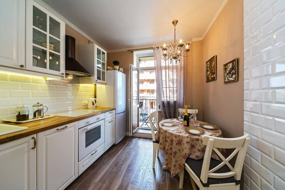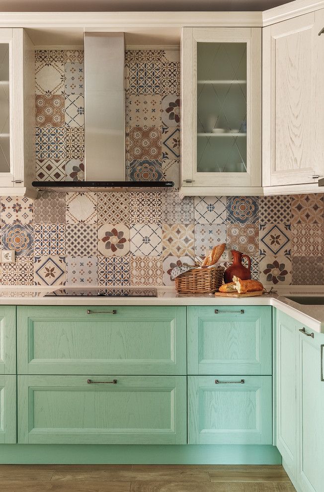 Coloristica se compune din pasteluri pe baza de roz, verde, albastru, galben si beige. In cazul bucatariei, acestea se intalnesc intr-un cadru retro conturat cu ajutorul design-ului mobilierului si patternului placilor de faianta care despart corpurile superioare de blat. Tot un aer vintage transmit si perdelele, zona de servire a mesei si corpurile de iluminat artificial iar intreaga organizare a spatiului face ca bucataria sa fie potrivita pentru un cadru de familie.