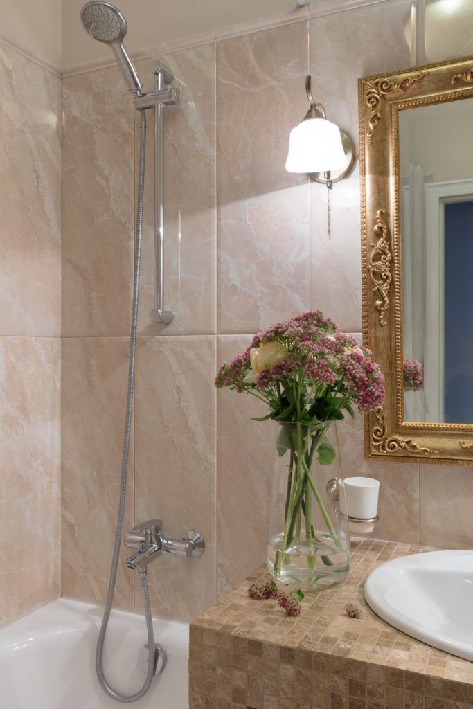 In dormitor avem o stilistica provensala usor mai pronuntata. Nuantele pastelate, tapetul si draperiile cu imprimeu floral, lustra si veiozele, precum si mobilierul creeaza un ambient placut si odihnitor. Pe aceeasi idee s-a mers si in amenajarea bailor (vezi cadrul de oglinda sau accesoriile).
