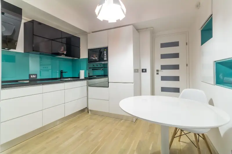 Pentru amenajarea bucatariei, s-a avut in vedere proiectarea unor corpuri de mobilier personalizate, care sa nu aglomereze inutil spatiul. Alternanta alb-negru este eleganta si atemporala, pusa in valoare de placarea cu sticla turcoaz a peretelui dintre cele doua randuri de corpuri. Aceasta dinamizeaza spatiul si sparge monotonia.