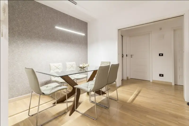 Zona de dining urmeaza linia rafinata a open space-ului, atat datorita tapetului argintiu, cat si scaunelor si mesei cu design modern – tablia din sticla a mesei ii pune in valoare picioarele din lemn, cu forma neobisnuita, iar corpul de iluminat minimalist, suspendat deasupra mesei, asigura iluminarea directa a acestei zone.