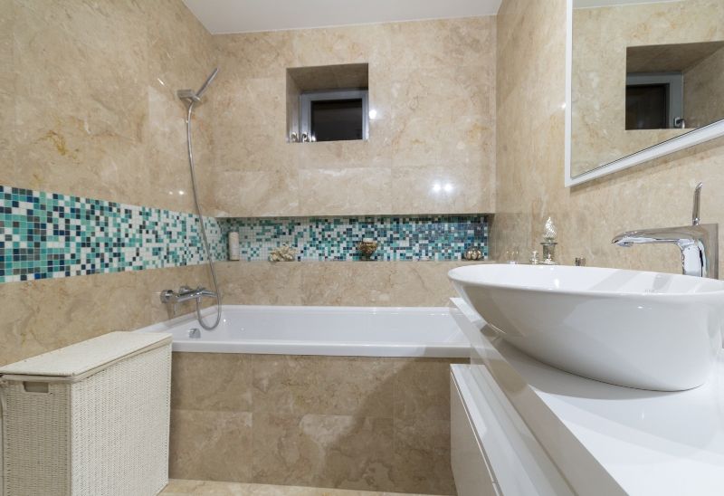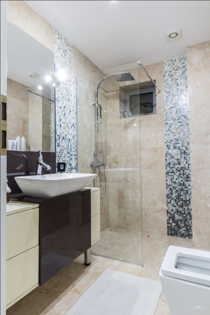 Apartamentul este dotat cu doua bai, ambele placate integral cu marmura Rose Beige de la Dalet (www.daletbaie.ro), pusa in valoare cu brauri de mozaic. Una dintre bai este amenajata cu dus, dotat cu scurgere in pardoseala si delimitat printr-un paravan de sticla, si mobilier din mdf alb si negru de la Dalet.