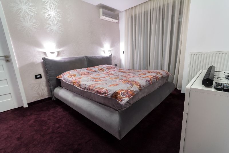 Dormitorul continua nota pretioasa a intregii amenajari, fiind acoperit de un covor visiniu, pe care se decupeaza patul gri, cu aer rafinat