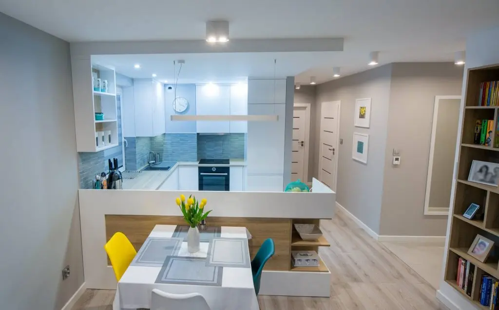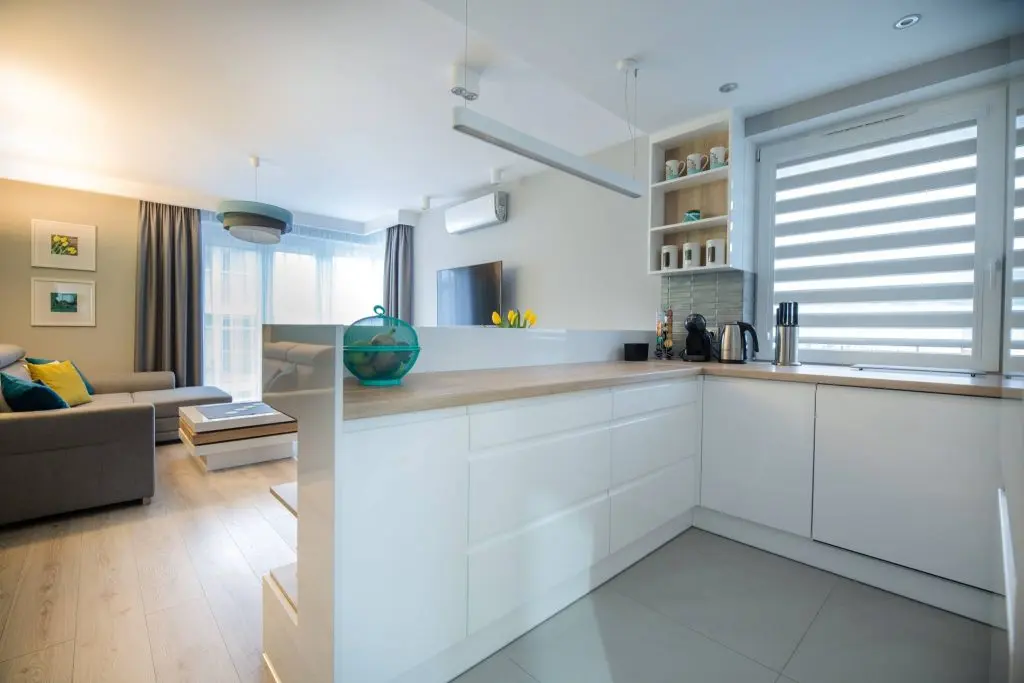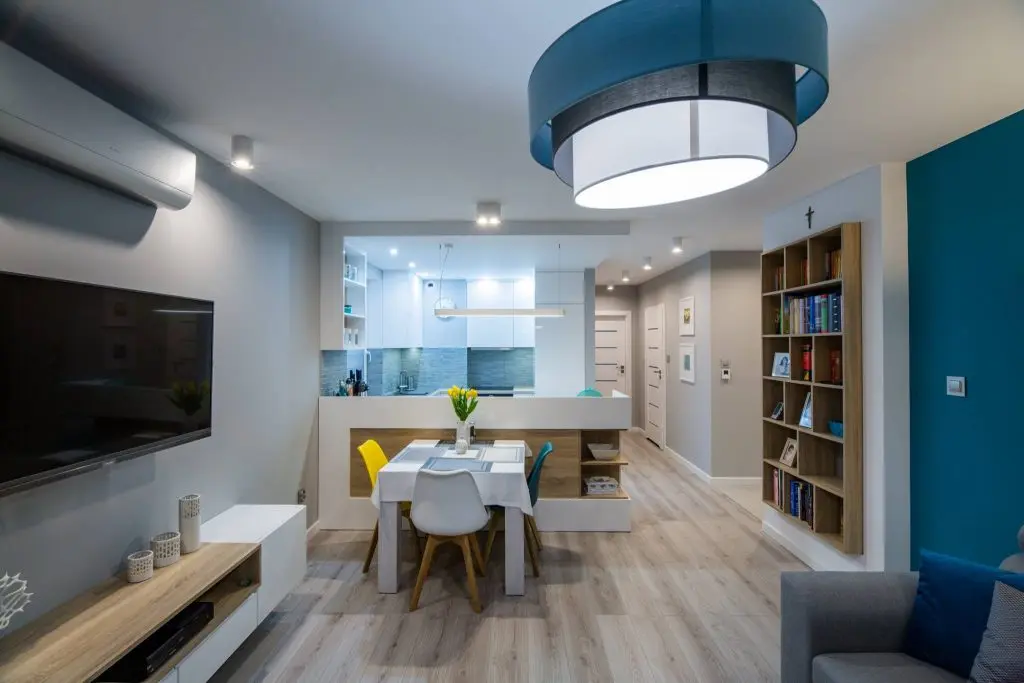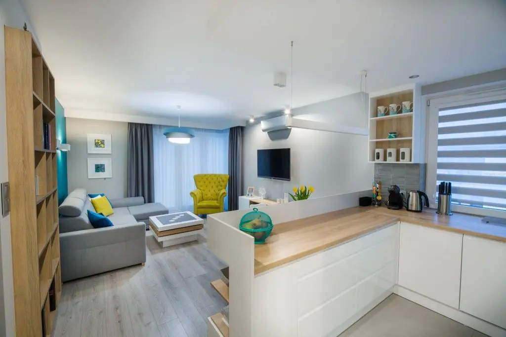 Una din camerele cele mai fidele design-ului scandinav este open space-ul format de bucatarie si living, unde se fac remarcate nuantele de alb imaculat, gri, turcoaz si galben, impreuna cu lemnul natural.