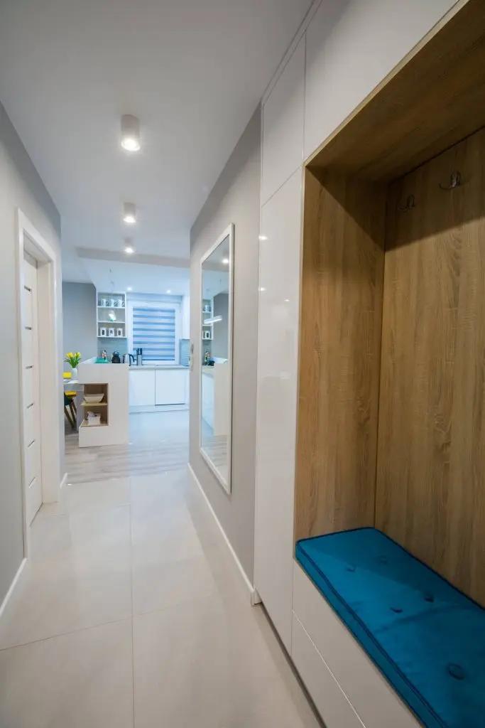 Holul este cel care face introducerea in subiectul amenajarii prin amplasarea unor spatii de odihna si depozitare si a unei oglinzi impresionante.