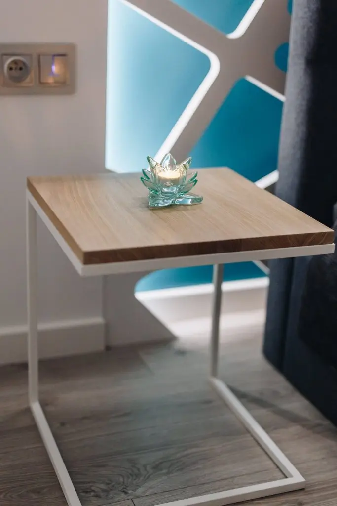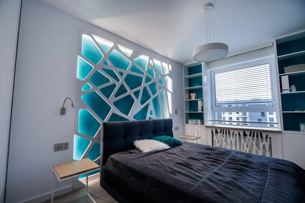 Abstractizarea in forma geometrica neregulata a acestuia si plasarea ledurilor pe fiecare parte, formeaza un efect optic rar intalnit, iar alegerea turcoazului ca nuanta de baza a peretelui principal nu doar ca plaseaza intreaga camera intr-un alt spatiu temporal, ci ii si ofera un aer tineresc. Intreg mobilierul respecta patternul principal si are un aspect minimalist.