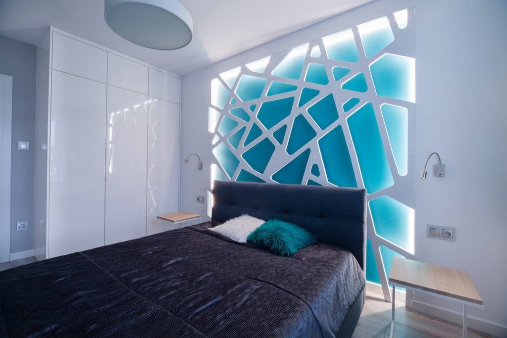 Abstractizarea in forma geometrica neregulata a acestuia si plasarea ledurilor pe fiecare parte, formeaza un efect optic rar intalnit, iar alegerea turcoazului ca nuanta de baza a peretelui principal nu doar ca plaseaza intreaga camera intr-un alt spatiu temporal, ci ii si ofera un aer tineresc. Intreg mobilierul respecta patternul principal si are un aspect minimalist.