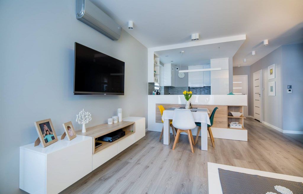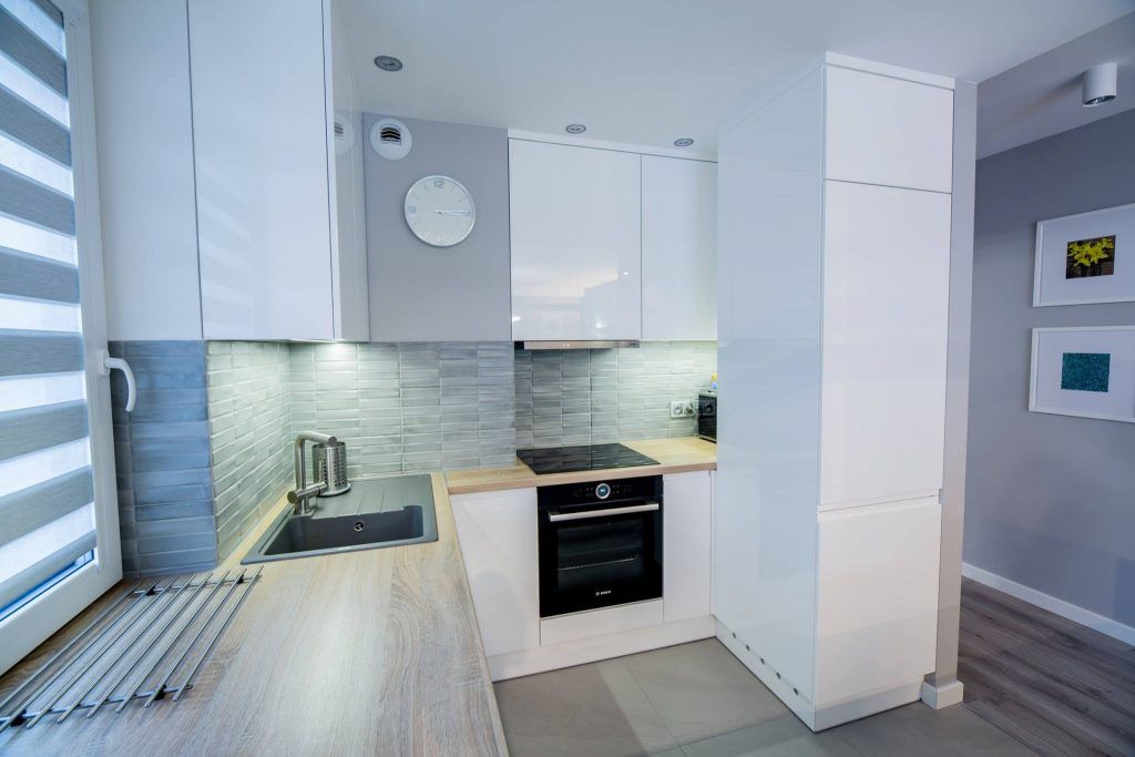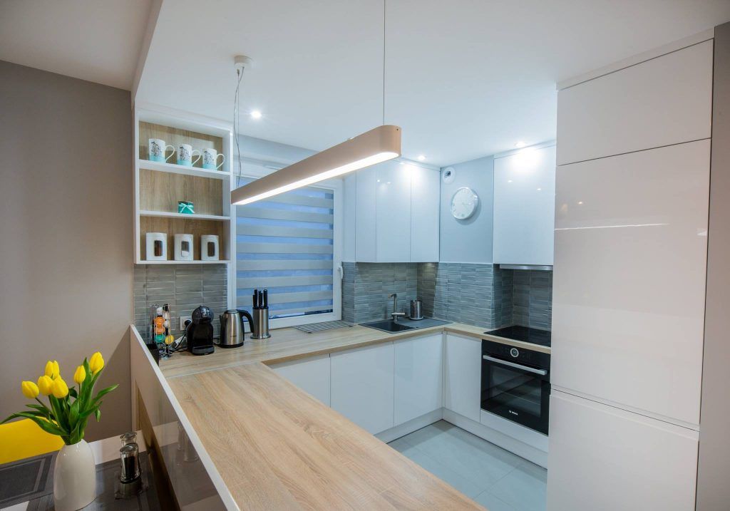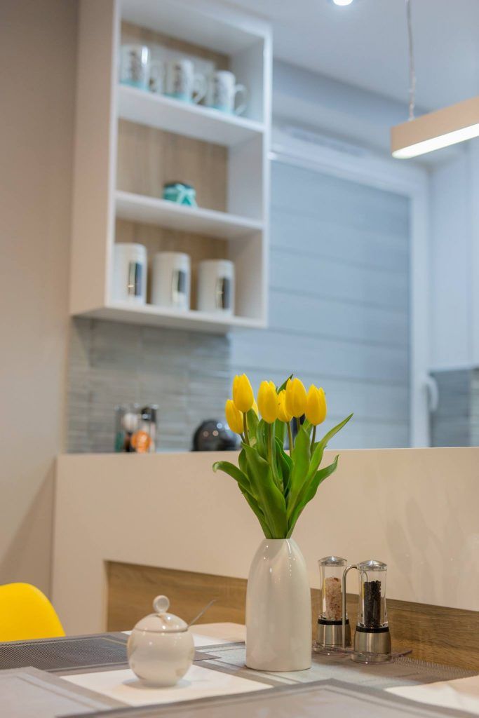 Una din camerele cele mai fidele design-ului scandinav este open space-ul format de bucatarie si living, unde se fac remarcate nuantele de alb imaculat, gri, turcoaz si galben, impreuna cu lemnul natural.