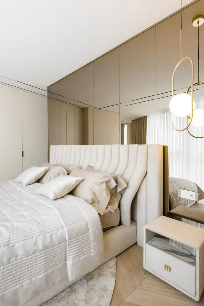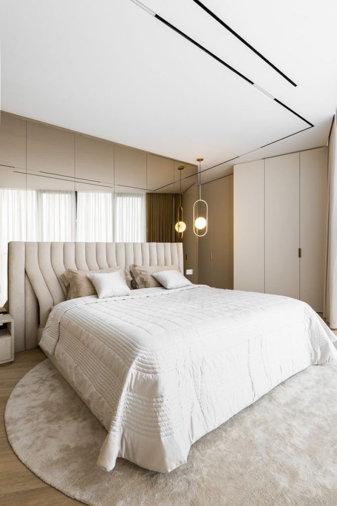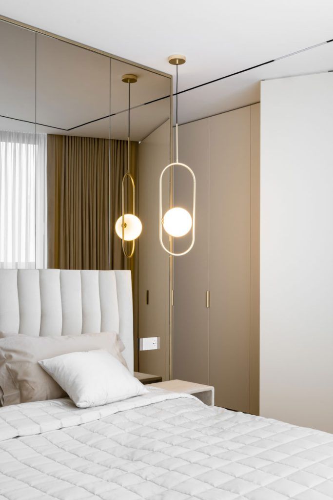 Fiecarui colt din aceasta locuinta i-a fost acordata atentia meritata, insa vedeta amenajarii ramane dormitorul matrimonial cu zona de dressing inclusa. Conturat in linii geometrice, simple, cat mai aerisit, acesta surprinde prin delicatetea texturilor si a detaliilor folosite. Placarea cu oglinda a peretelui cu tablia de pat mareste vizual spatiul si il face sa para mai luminos.