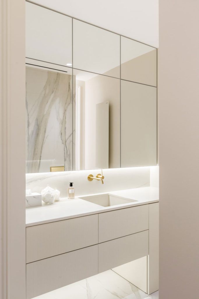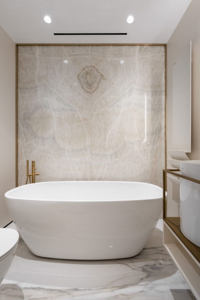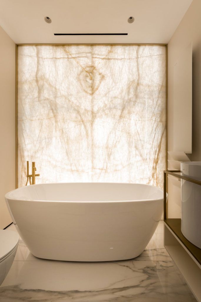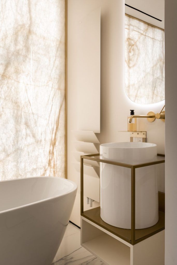 In baia matrimoniala se continua aceeasi linie stilistica, predomina albul cu accente metalice aurii. Cada freestanding este pusa in valoare de peretele de fundal, placat cu Onyx retroiluminat (iluminat cu benzi led pe spate, efectul este unul surprinzator).