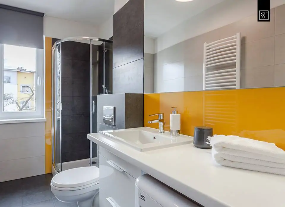 Si in dormitor a fost continuata ideea tonurilor neutre si a designului functional. Intr-o nisa au fost incastrate dulapurile pentru haine. Pentru baie, designerii au mizat pe o abordare mai indrazneata folosind griuri si accente de negru si galben.