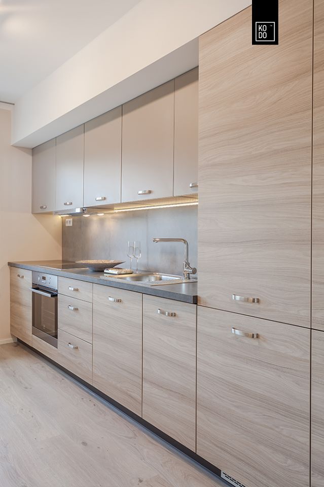 Designul mobilierului este simplu, iar electrocasnicele incorporate. Benzile L ED montate sub dulapuri asigura un iluminat de accent necesar pentru zona blatului de lucru.