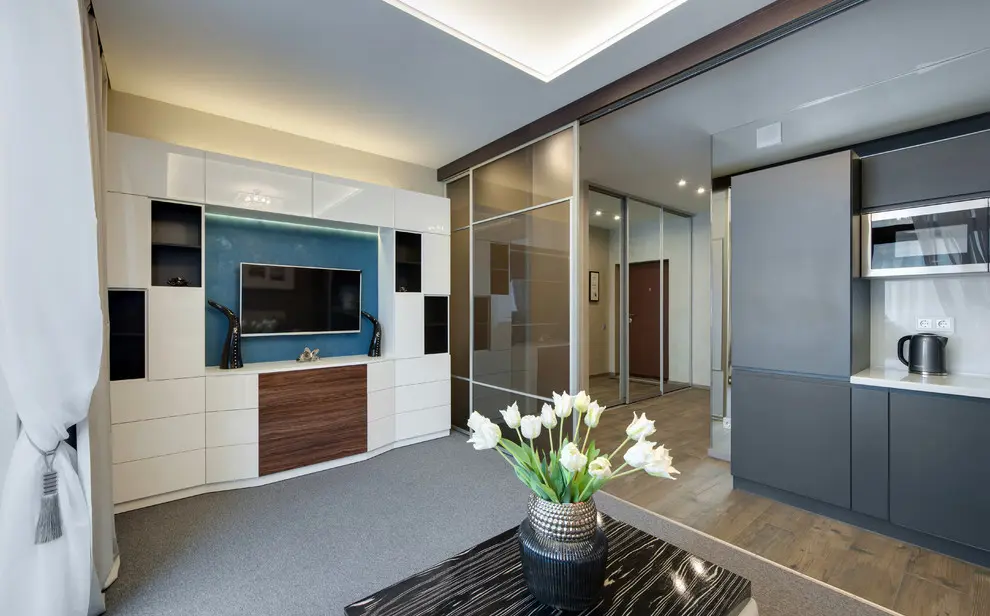 Pentru astazi am ales sa va prezentam o amenajare ce are configuratia unui apartament cu o singura camera. Un spatiu de 34 mp a carui amenajare a fost gandita sa ofere un echilibru intre functional si estetic.