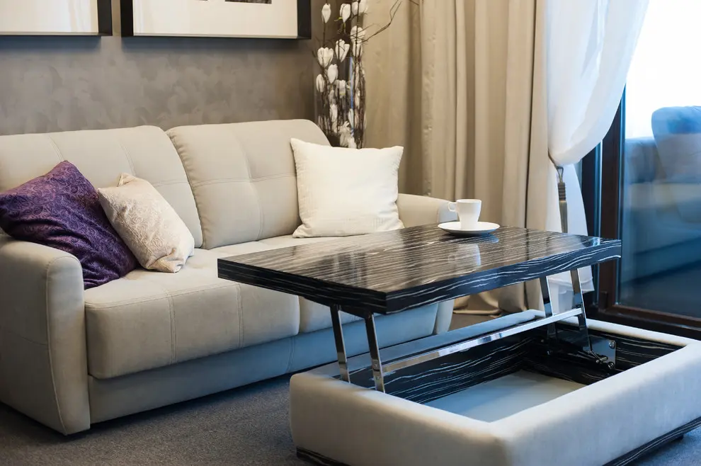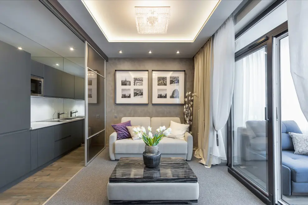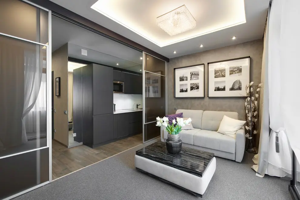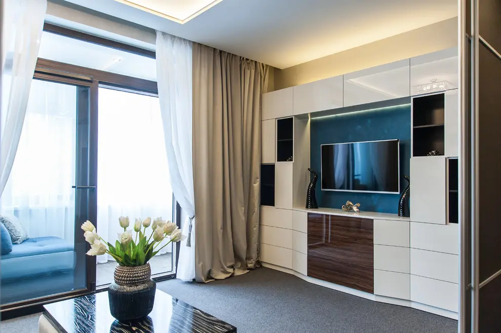 Living-ul si dormitorul se contopesc iuntr-o singura camera iar elementul cheie este canapeaua extensibila, multifunctionala ce se transforma cu usurinta intr-un pat dublu de mijloc. Restul mobilierului din camera este adaptat spatiului: o masuta practica cu rotile si o mobila de perete. Un interior curat, simplu cu o schema de culori neutra: gri-maro, bej-auriu, alb si albastru, cutexturi de lemn si sticla. Atmosfera este una primitoare, calda, cu multa lumina naturala, gratie ferestrelor inalte.