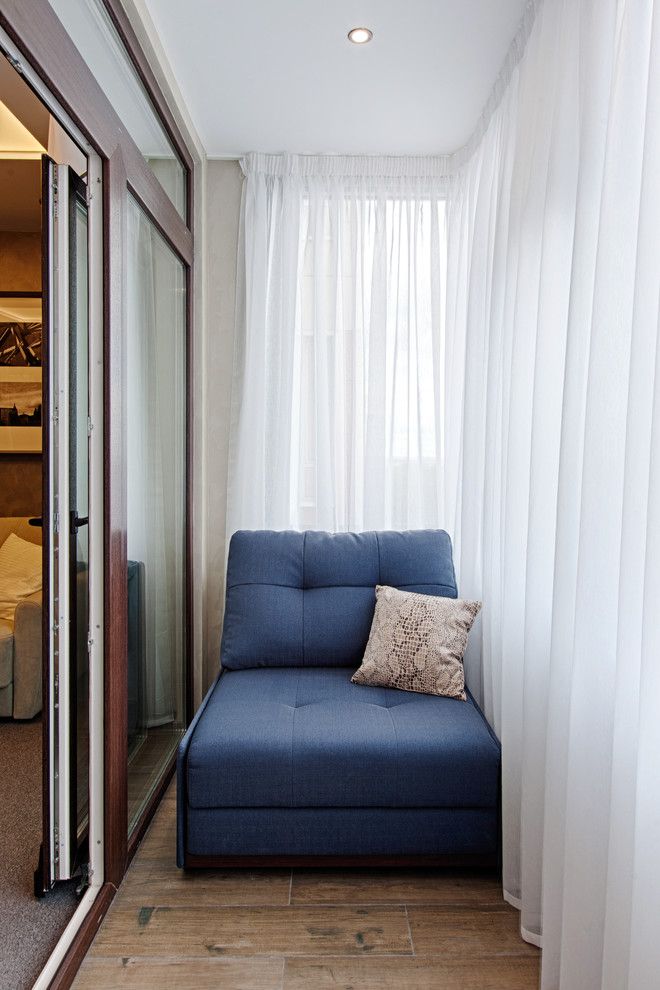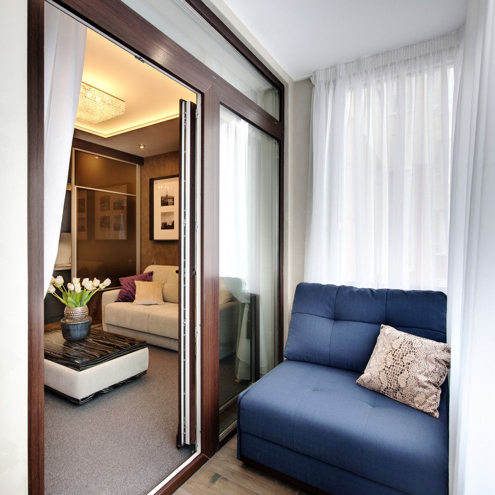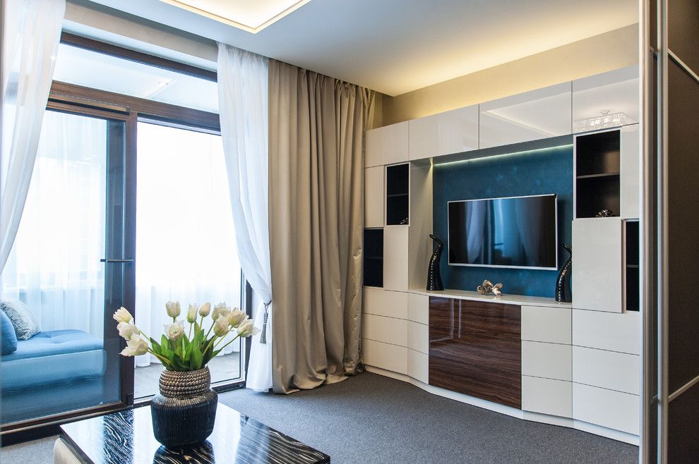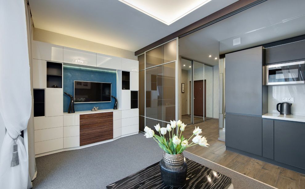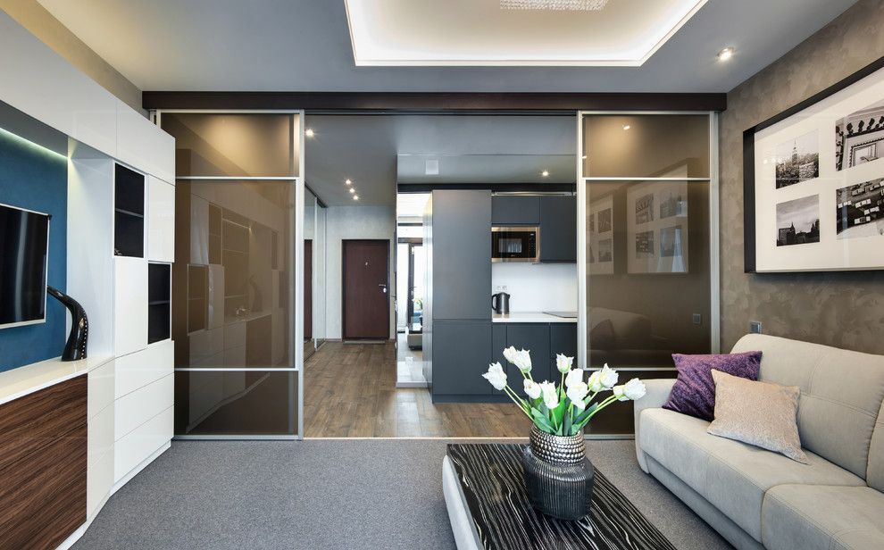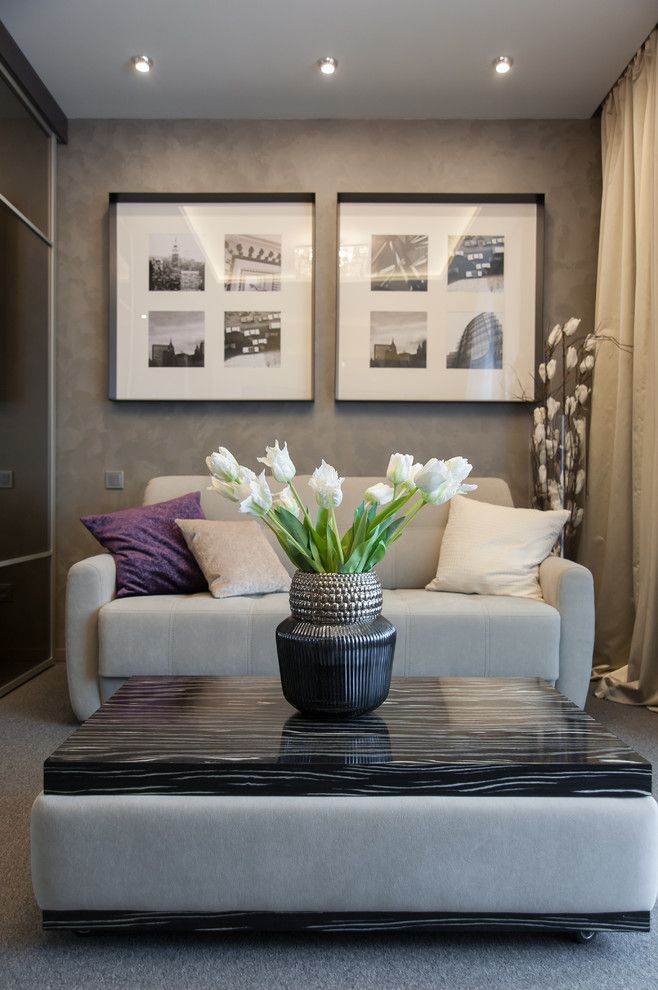 Living-ul si dormitorul se contopesc iuntr-o singura camera iar elementul cheie este canapeaua extensibila, multifunctionala ce se transforma cu usurinta intr-un pat dublu de mijloc. Restul mobilierului din camera este adaptat spatiului: o masuta practica cu rotile si o mobila de perete. Un interior curat, simplu cu o schema de culori neutra: gri-maro, bej-auriu, alb si albastru, cutexturi de lemn si sticla. Atmosfera este una primitoare, calda, cu multa lumina naturala, gratie ferestrelor inalte.