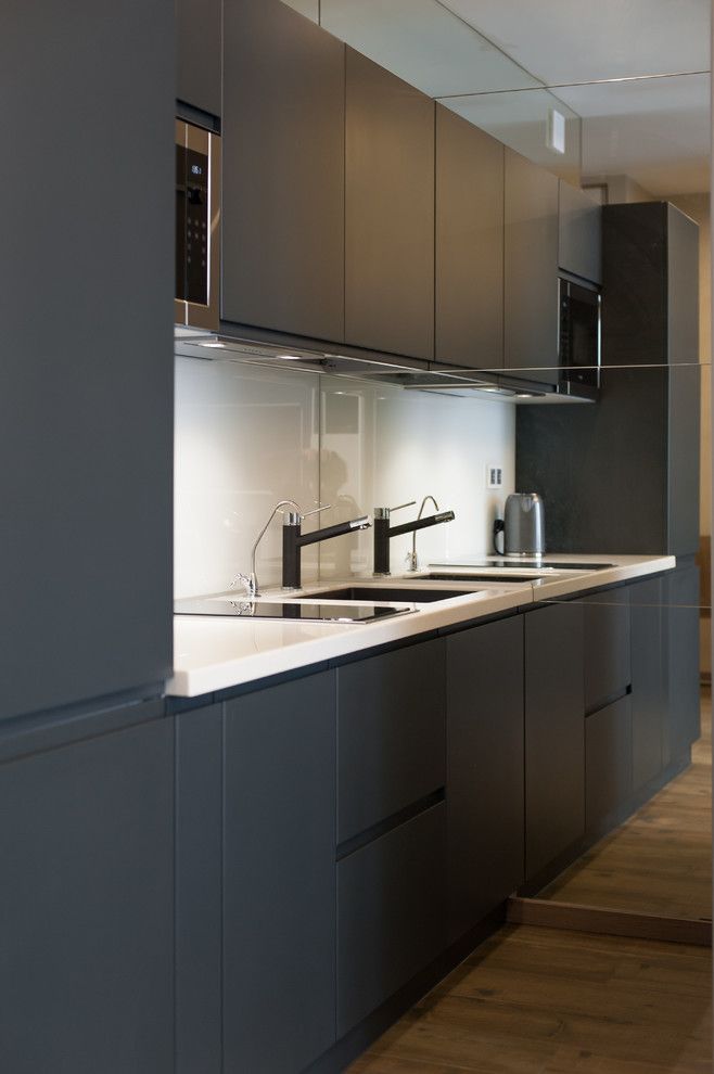 Bucataria este lunga si ingusta cumunicand direct cu holul iar mobilierul dispus pe o singura latura cu electrocanicele incorporate. Chiar daca mobila este gri, albul panoului de sticla, al tavanului si al blatului de lucru reusesc sa ofere luminozitatea necesara si sa creeze impresia de spatialitate. Ordonat si compact, spatiul respira si nu lasa impresia de aglomerat.