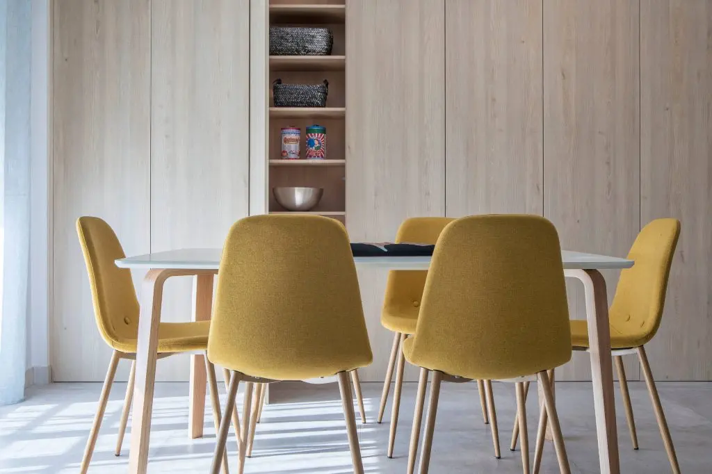 Diningul continua linia stilistica a amenajarii, generand o atmosfera calda, cu nuante deschise ale peretilor , accentul fiind pus pe scaunele stil Eames imbracate intr-o tesatura galbena. Opus peretelui de caramida aparenta din living, in zona de dining inaltim un perete furniruit cu lemn de fag, ale carui verticale tradeaza discret un spatiu generos de depozitare.