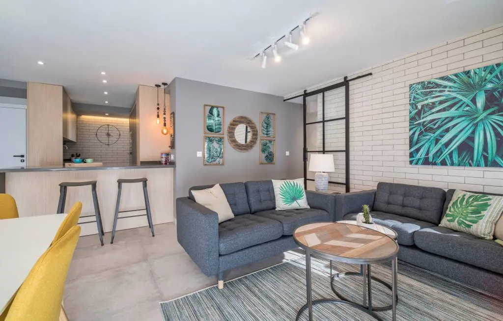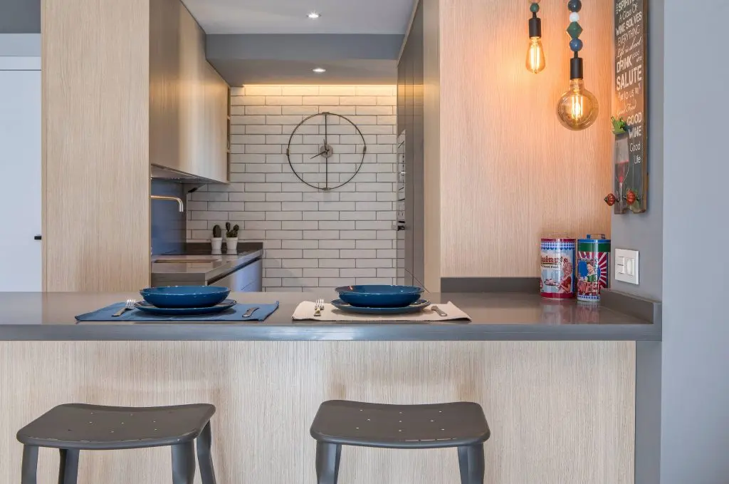 Separarea zonei de canapele si loc de luat masa de bucatarie a fost realizata printr-un bar retro, foarte util pentru servirea micului dejun. Peretele din continuarea barului este tratat intr-o nuanta de gri cald, oferind un fond neutru pentru tablourile cu motive botanice. Iluminatul este realizat discret, printr-o lampa suspendata, cu becuri aparente care emana lumina calda.