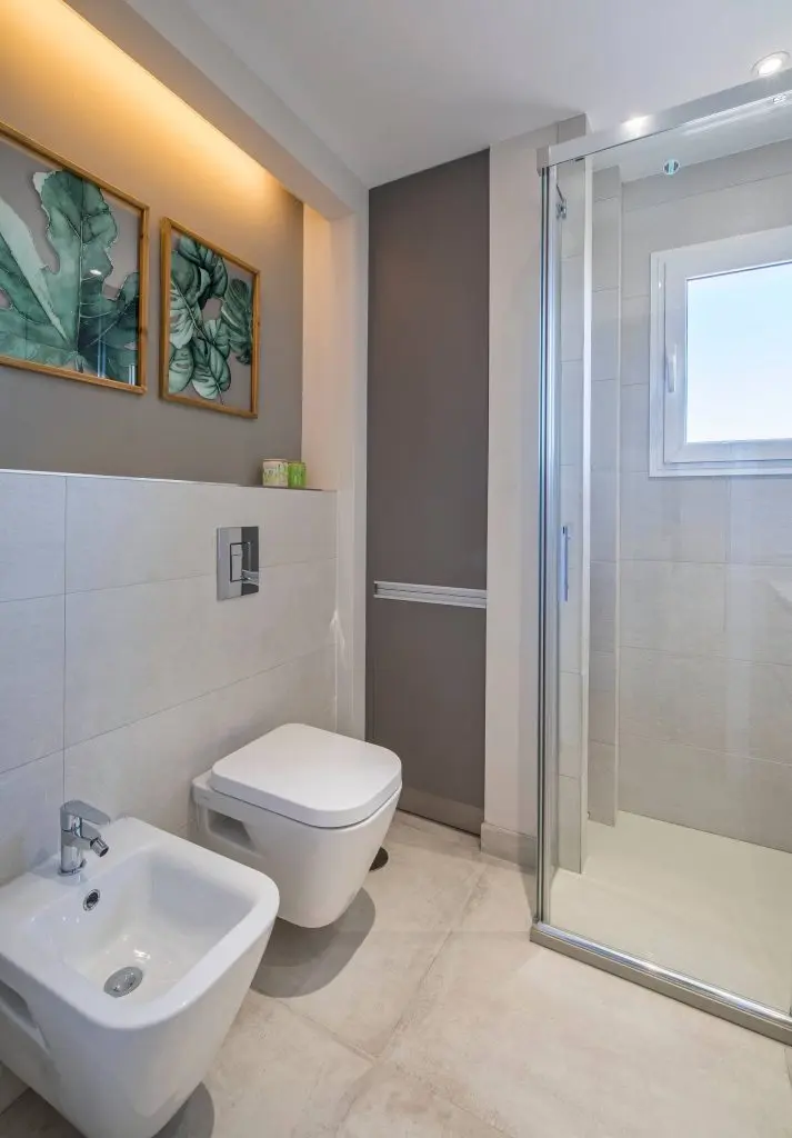 Alegerea aceluiasi ton de culoare pentru gresia si faianta din baie contribuie la perceptia unui spatiu amplu. Prin nuantele deschise ale finisajelor si cele doua tablouri cu frunze intens colorate, baia continua in mod placut stilul abodat in amenajarea zonei de zi.