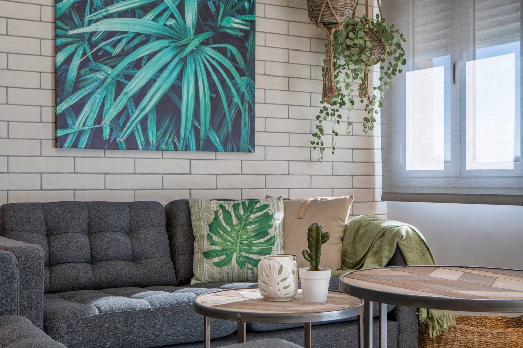 Prin finisajele folosite si dispunerea mobilierului, zona de zi transmite caldura, fiind un spatiu primitor, cu un aer tineresc, jovial. Remarcam accentele de inspiratie vegetala, plantele naturale suspendate intr-un colt al plafonului (aproape de fereastra pentru a beneficia de cat mai multa lumina naturala); pernele decorative cu imprimeuri vegetale; tabloul din spatele canapelei, pus in evidenta de peretele din caramida aparanta alba. Intr-un decor in care predomina culorile deschise, griul inchis al tesaturii folosite la canapele subliniaza armonios zona-nucleu a casei.