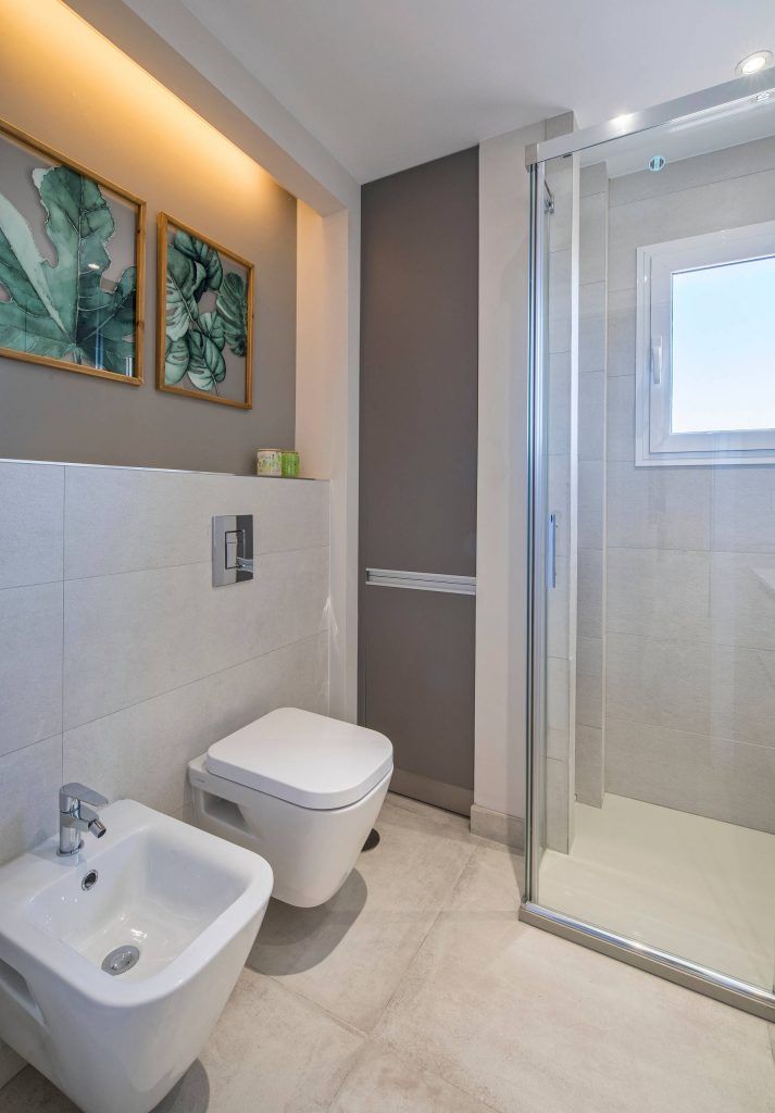Alegerea aceluiasi ton de culoare pentru gresia si faianta din baie contribuie la perceptia unui spatiu amplu. Prin nuantele deschise ale finisajelor si cele doua tablouri cu frunze intens colorate, baia continua in mod placut stilul abodat in amenajarea zonei de zi.