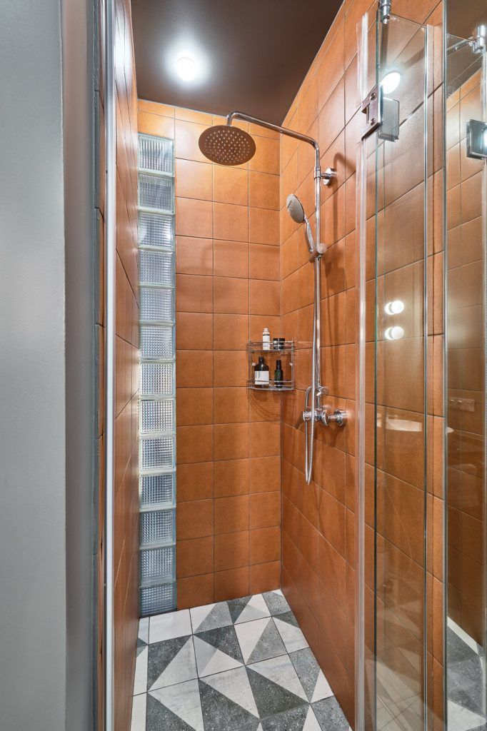 Baia nu este iluminata natural, insa designerii au folosit un truc pentru a aduce putine lumina naturala din zona de zi: au propus o coloana de caramida de sticla in cabina de dus.