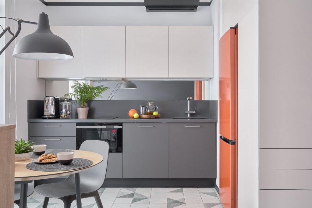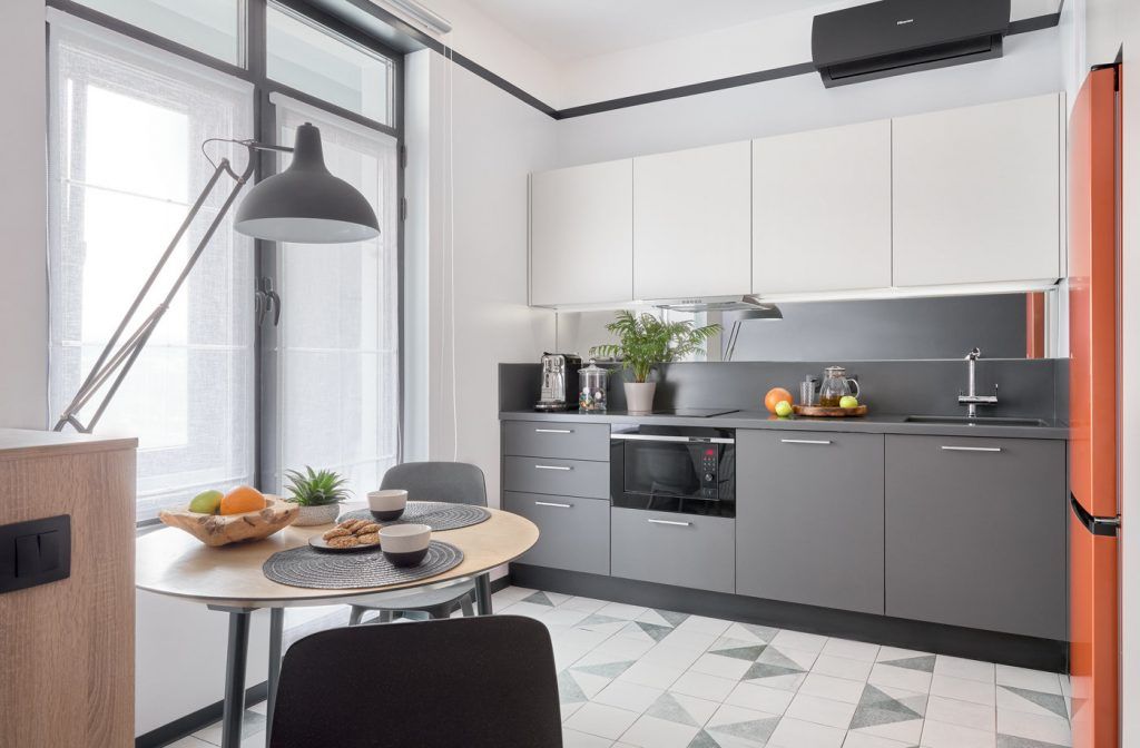 Fasia de oglinda utilizata deasupra blatului de lucru mareste vizual spatiul si face ca partea de jos a bucatariei sa semene mai mult cu o comoda, in timp ce corpurile albe de deasupra sunt si ele o prezenta eleganta.