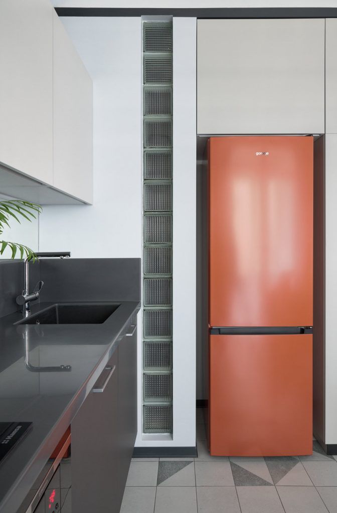 Bucataria, desi pare mica la prima vedere, dispune de tot ce ese necesar inclusiv spatii suficiente de depozitare. Prin folosirea unor electrocasnice incorporabile mici au castigat spatiu pentru blatul de lucru si zona de dulapuri.