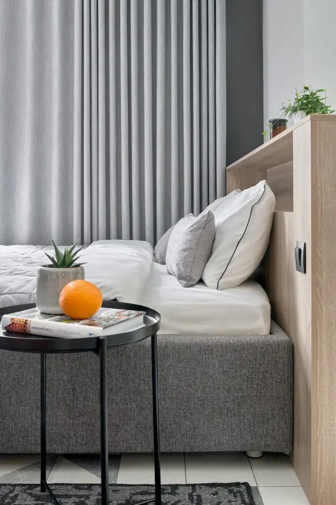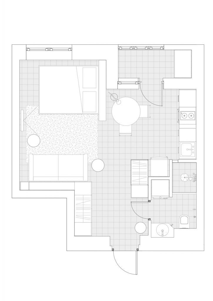 Pereti de compartimentare regasim doar pentru a delimita baia. A rezultat astfel un spatiu compact si ergonomic, bucataria, livingul si dormitorul sunt integrate intr-o singura camera, tratate ca zone functionale izolate dar care interactioneaza foarte bine intre ele. Prin mobilarea propusa, au lasat spatiu si pentru eventuale schimbari de decor in viitor.