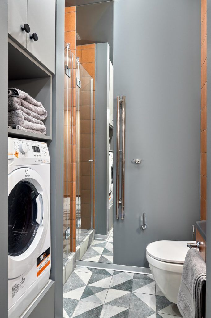 Destul de generoasa pentru o locuinta de dimensiuni reduse, baia dispune de o cabina de dus mare, un dulap incastrat cu masina de spalat rufe, uscator si zona de depozitare, zona de lavoar si vasul de toaleta cu dusul montat pe laterala blatului pentru lavoar.
