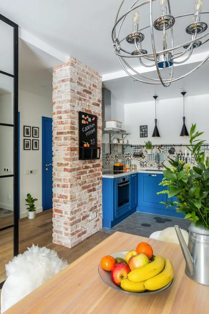 Camera de zi este un spatiu care primeste multa lumina naturala. Astfel, designerul a mizat pe acest detaliu atunci cand a reconfigurat apartamentul. Bucataria, aflata acum in capatul opus al ferestrei primeste parte din aceasta lumina, permitand o abordare mai indrazneata la nivelul cromaticii. Vei intalni aici albastru si placi decorative colorate care scot din banal amenajarea bucatariei. O atentie deosebita a fost acordata iluminatului artificial. Pentru ca fiecare zona din apartament sa fie pusa in valoare, designerul a prevazut diferite surse de iluminat, de la spoturi incastrate, pana la aplice si corpuri suspendate pentru accentuarea unui detaliu.