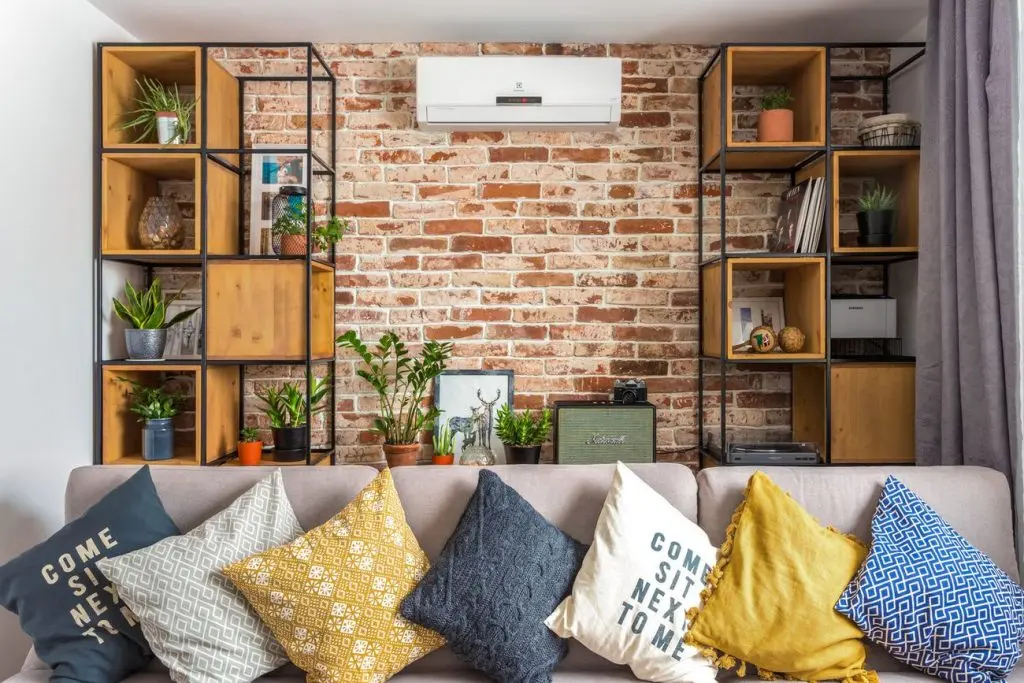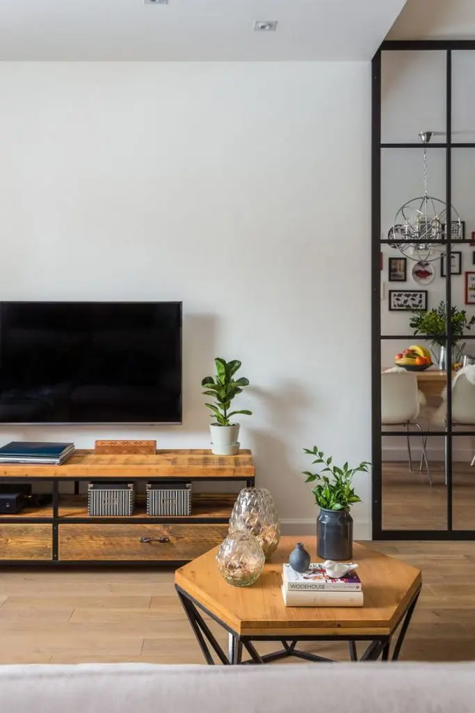 In living, s-a conturat un spatiu cu usoare influente industriale, fara a parea rece si neprietenos. Din contra, canapeaua decorata cu multe perne colorate imprima un sentiment de confort. In spatele ei, au fost integrate doua corpuri tip cuburi de lemn simetric dispuse. Conceptul cadrului metalic care le sustine este preluat si la nivelul masutei de cafea, al corpului de sub televizor sau chiar al ramelor pentru oglinzi.