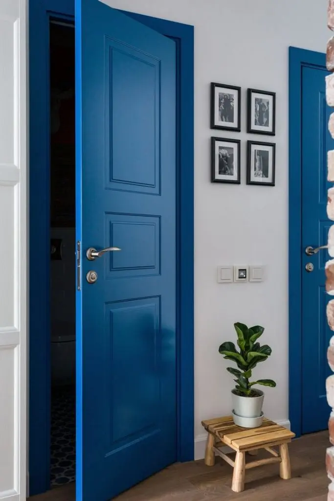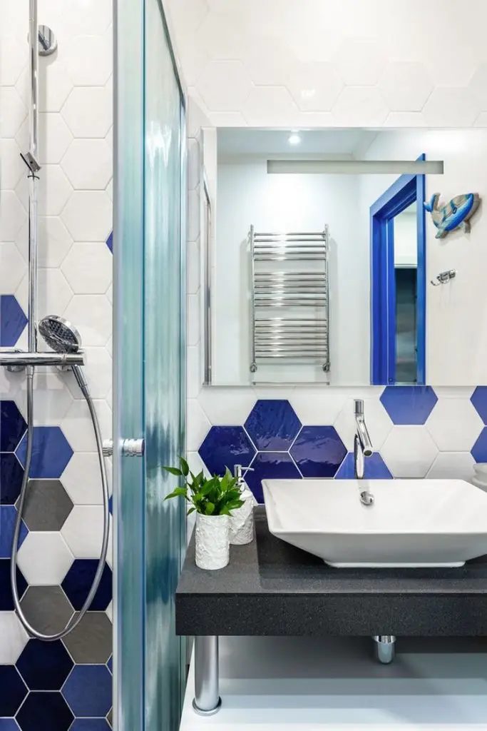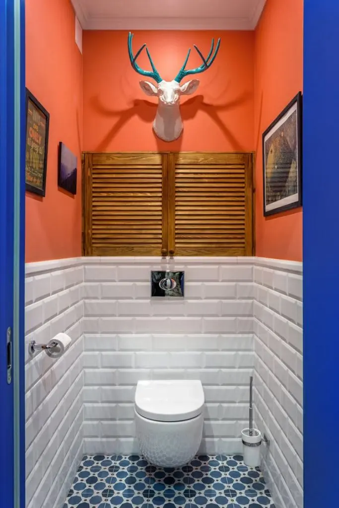Jocul cromatic nu se opreste aici. Cele doua bai ne bucura din plin privirea cu accente puternice de albastru si oranj. Baia principala este mai potolita printr-o imbinare echilibrata de albastru si alb, cu baza de gri la nivelul pardoselii. Placile hexagonale dispuse voit haotic au rolul sa distraga privirea de la dimensiunile reduse ale incaperii. Cat despre baia de serviciu, destinata doar toaletei, oranjul face toata atmosfera.