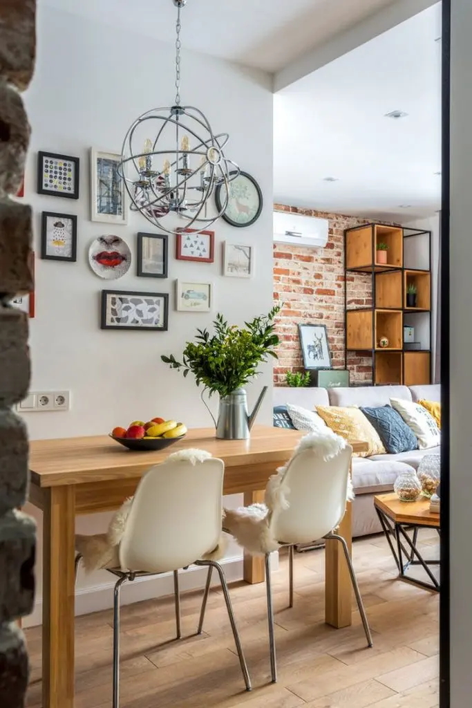 Trecerea intre camera de zi si bucatarie o face discret zona de luat masa, un spatiu evidentiat printr-un corp tip glasvand cu oglinzi de o parte si tablouri de diferite marimi de cealalta parte. De neratat este si corpul de iluminat! Prin pozitionarea oglinzilor s-a creat o iluzie de largire a spatiului, ele reflectand totodata si parte din lumina. De retinut acest truc!
