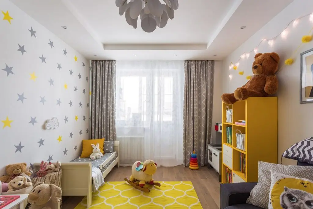 Camera copilului vine cu accente de galben in contrast cu tonuri cuminti de gri. Paleta de culori si imprimeurile vesele te binedispun. Si aceasta incapere se bucura de multa lumina naturala.