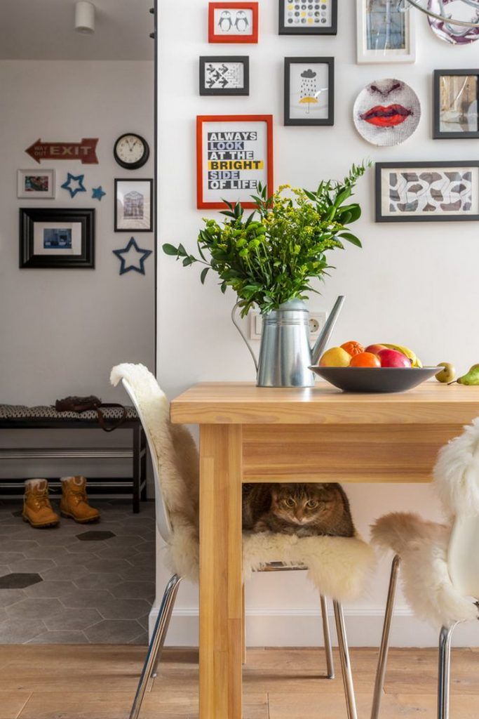Trecerea intre camera de zi si bucatarie o face discret zona de luat masa, un spatiu evidentiat printr-un corp tip glasvand cu oglinzi de o parte si tablouri de diferite marimi de cealalta parte. De neratat este si corpul de iluminat! Prin pozitionarea oglinzilor s-a creat o iluzie de largire a spatiului, ele reflectand totodata si parte din lumina. De retinut acest truc!