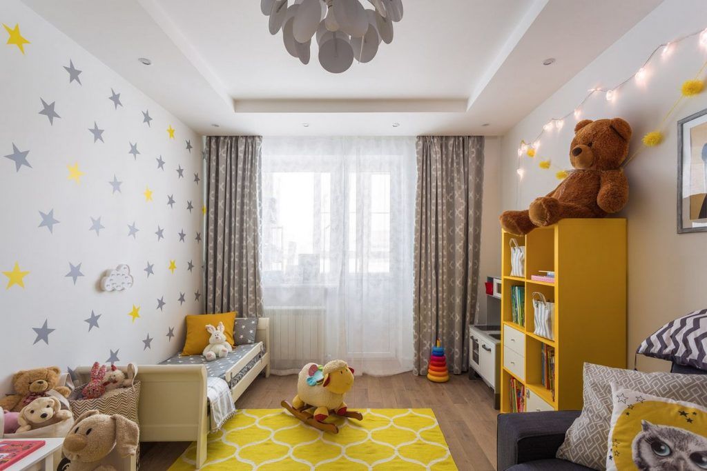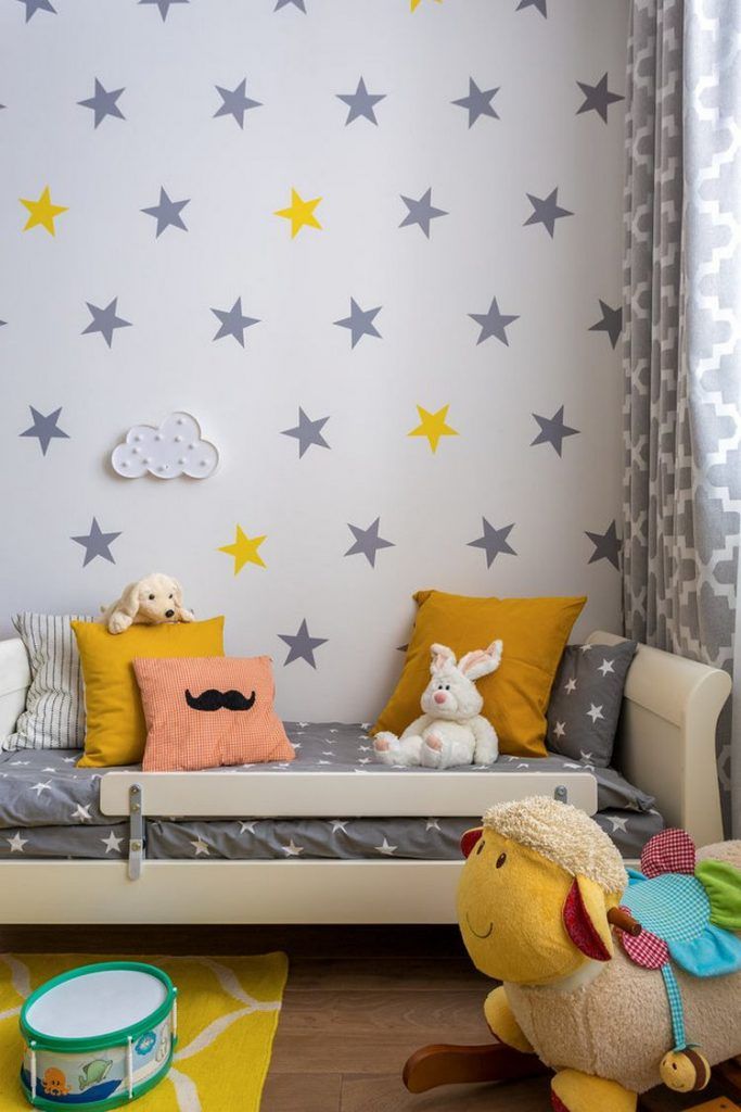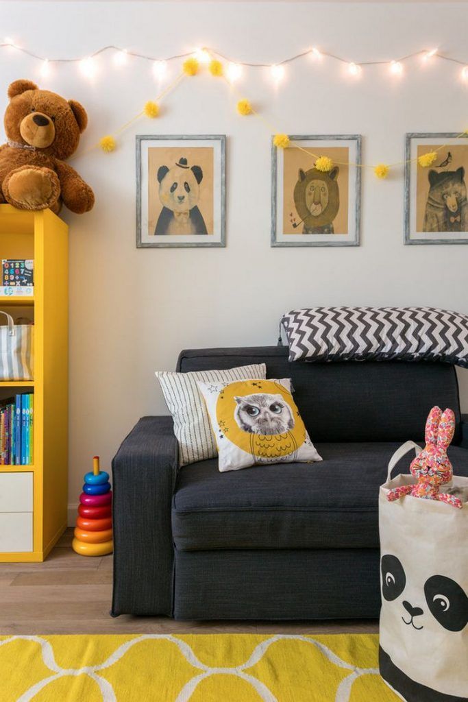 Camera copilului vine cu accente de galben in contrast cu tonuri cuminti de gri. Paleta de culori si imprimeurile vesele te binedispun. Si aceasta incapere se bucura de multa lumina naturala.