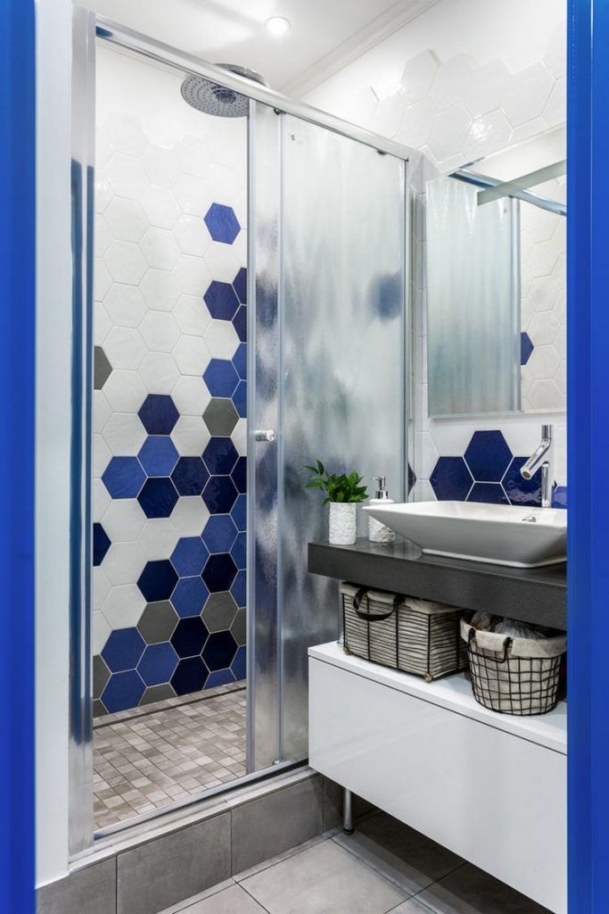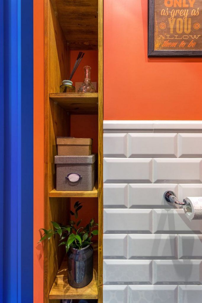 Jocul cromatic nu se opreste aici. Cele doua bai ne bucura din plin privirea cu accente puternice de albastru si oranj. Baia principala este mai potolita printr-o imbinare echilibrata de albastru si alb, cu baza de gri la nivelul pardoselii. Placile hexagonale dispuse voit haotic au rolul sa distraga privirea de la dimensiunile reduse ale incaperii. Cat despre baia de serviciu, destinata doar toaletei, oranjul face toata atmosfera.