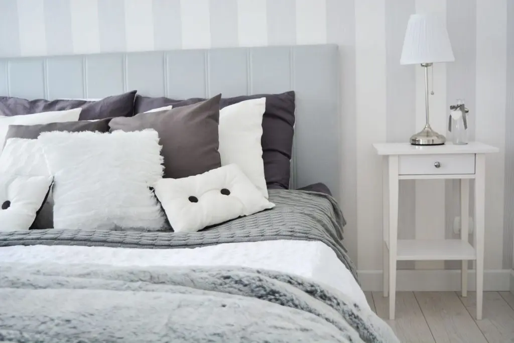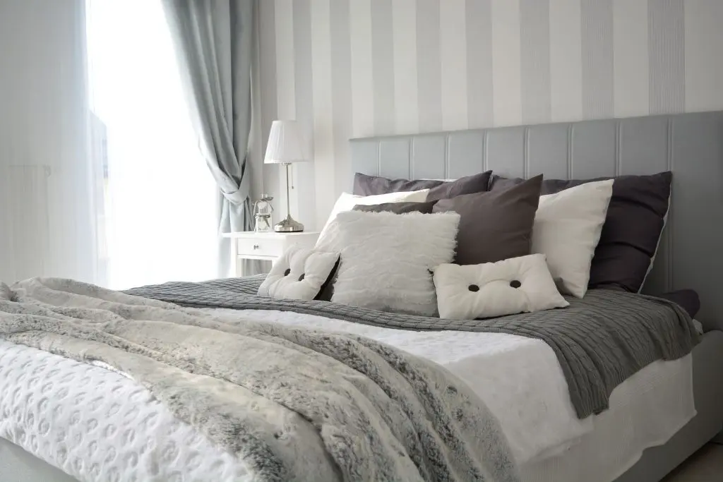 Spre deosebire de vibranta zona de zi, dormitorul vine intr-un ton mult mai calmant. Diferitele tonuri de griuri, imprimeurile si mai ales texturile ne descriu o camera eleganta, ce imbie la relaxare. Tapetul cu un imprimeu in dungi are rolul de a contura o zona de accent, iar dungile verticale au rolul de a spori senzatia de inaltime a incaperii.