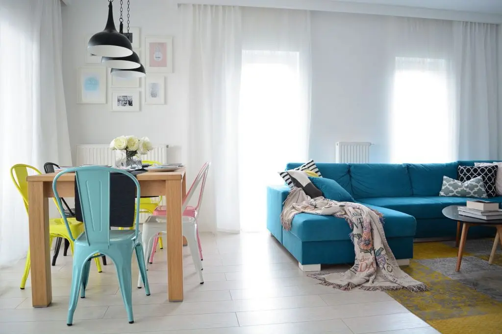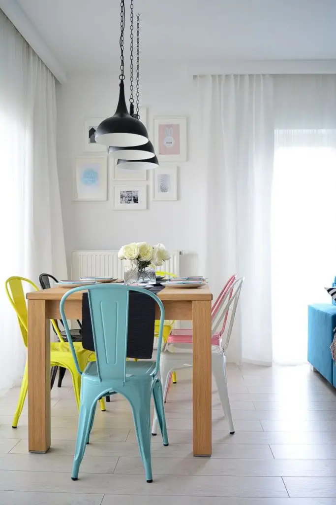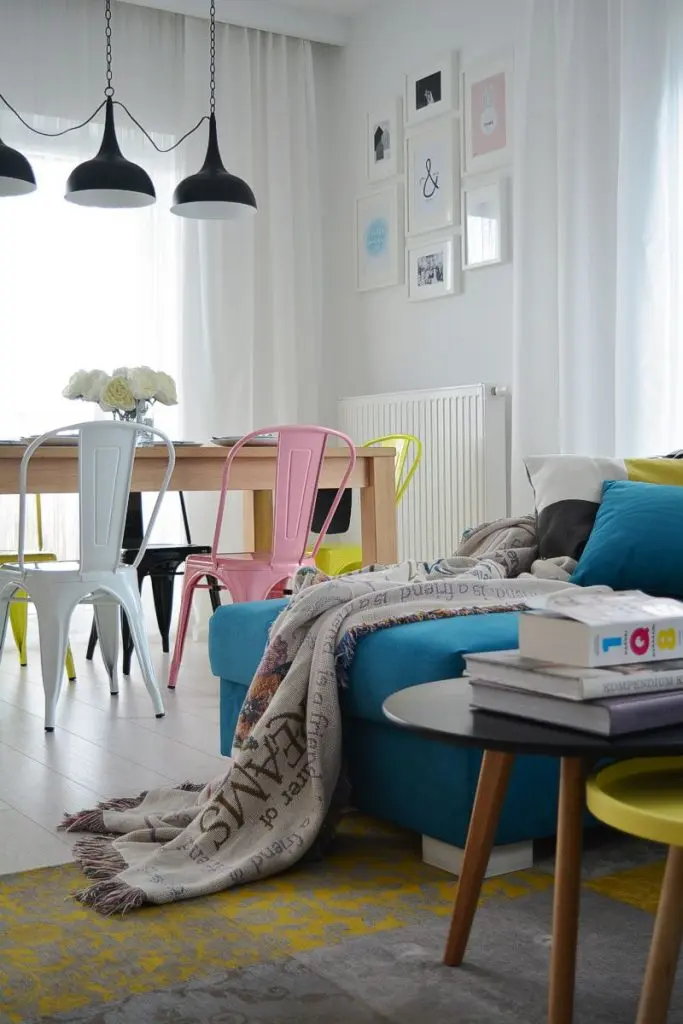 Pentru zona de living, canapeaua albastra este in centrul atentiei, atragand orice privire atat prin culoare, cat si prin designul modular. Intensitatea albastrului pare sporita pe fundalul alb, iar culorile din jur o completeaza minunat. Diversele tuse de galben, negru sau turcoaz vin sa accentueze piesele ce definesc functiunile, cum ar fi corpurile de iluminat negre suspendate deasupra mesei. Scaunele Tolix, fiecare in alta culoare pun in valoare acest spatiu al casei diningul.