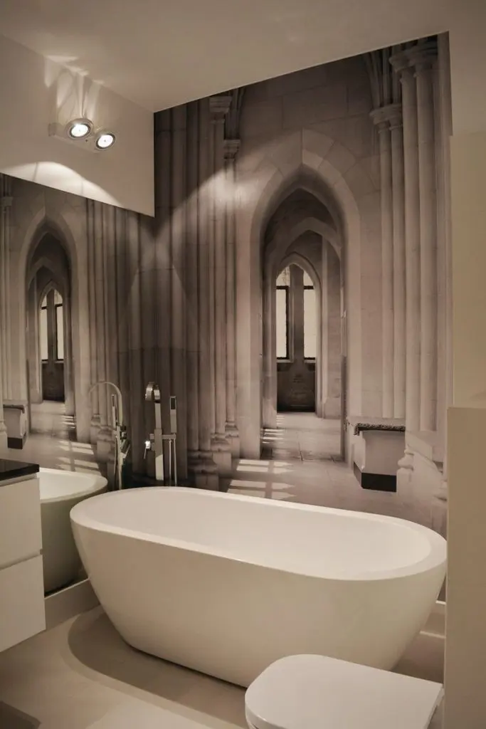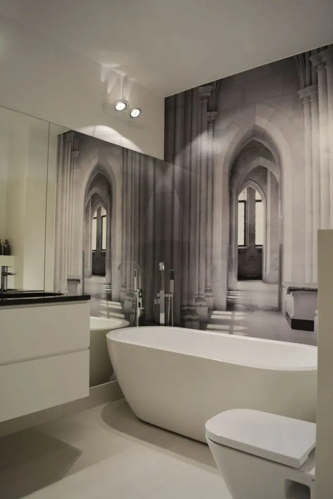 Si pentru ca tot suntem la capitolul rasfat, trebuie sa mentionam baia. Aici, un fototapet asezat in dreptul cazii, iti va crea sentimentul ca te afli intr-o alta lume, efectul fiind acela de profunzime si marire a spatiului. Eleganta decorului si excelenta executie per ansamblu ne face sa admiram indelung aceasta amenajare!