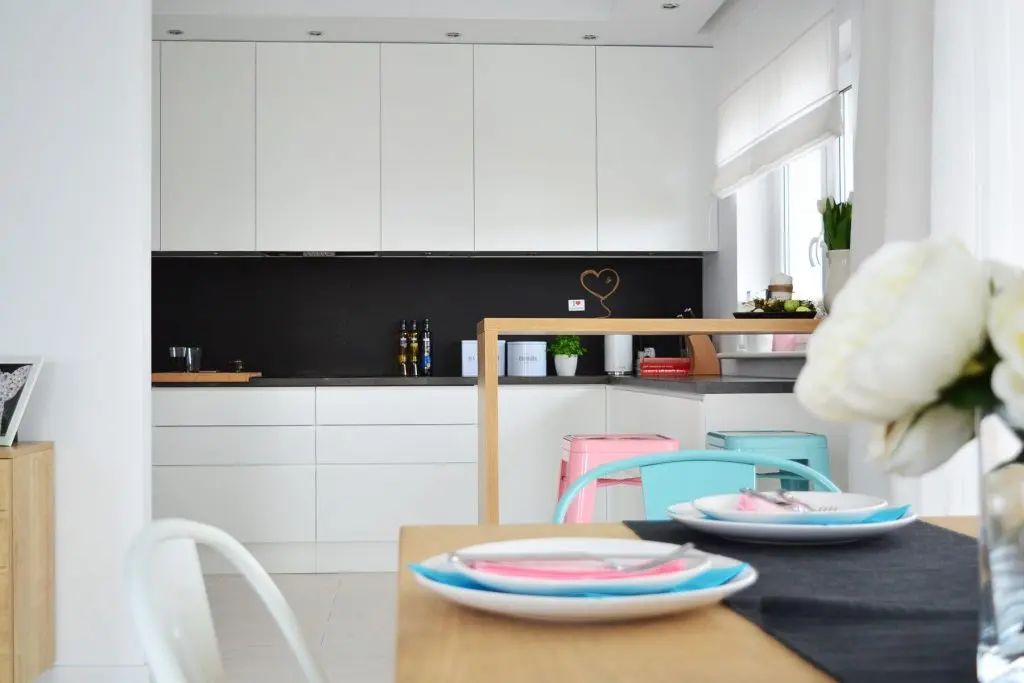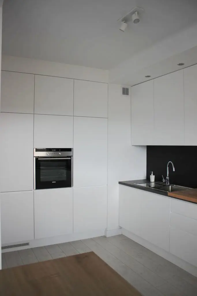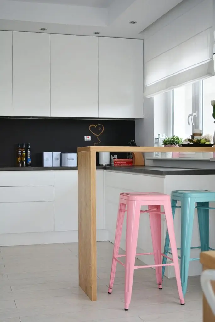Bucataria vine ca o prelungire a zonei de zi intr-o varianta alb-negru. Monotonia este sparta de aceleasi insertii de pasteluri, dar doar la nivelul decoratiunilor. Corpurile principale de mobilier sunt albe, cu un design minimalist si electrocasnice incorporate pentru a spori efectul unitar. Blatul negru si frontul dintre corpuri finisat cu vopsea neagra (pe care se poate scrie sau desena) confera o eleganta discreta bucatariei. si aici spatiul se bucura de lumina naturala gratie ferestrei existente. Separarea intre zone se face vizual printr-un corp tip bar.