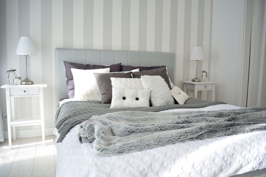 Spre deosebire de vibranta zona de zi, dormitorul vine intr-un ton mult mai calmant. Diferitele tonuri de griuri, imprimeurile si mai ales texturile ne descriu o camera eleganta, ce imbie la relaxare. Tapetul cu un imprimeu in dungi are rolul de a contura o zona de accent, iar dungile verticale au rolul de a spori senzatia de inaltime a incaperii.