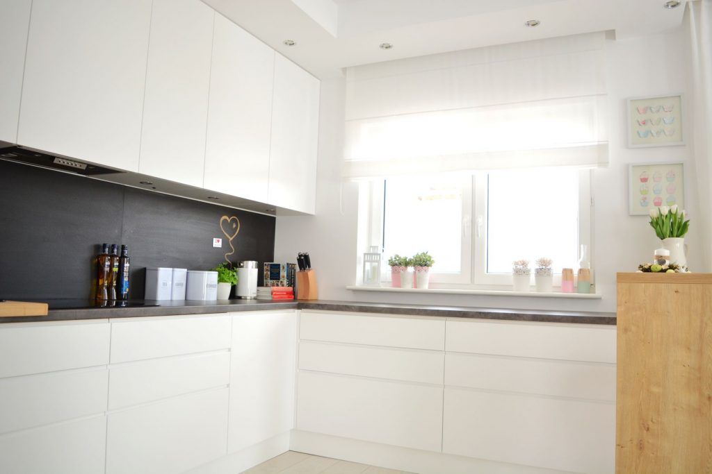 Bucataria vine ca o prelungire a zonei de zi intr-o varianta alb-negru. Monotonia este sparta de aceleasi insertii de pasteluri, dar doar la nivelul decoratiunilor. Corpurile principale de mobilier sunt albe, cu un design minimalist si electrocasnice incorporate pentru a spori efectul unitar. Blatul negru si frontul dintre corpuri finisat cu vopsea neagra (pe care se poate scrie sau desena) confera o eleganta discreta bucatariei. si aici spatiul se bucura de lumina naturala gratie ferestrei existente. Separarea intre zone se face vizual printr-un corp tip bar.