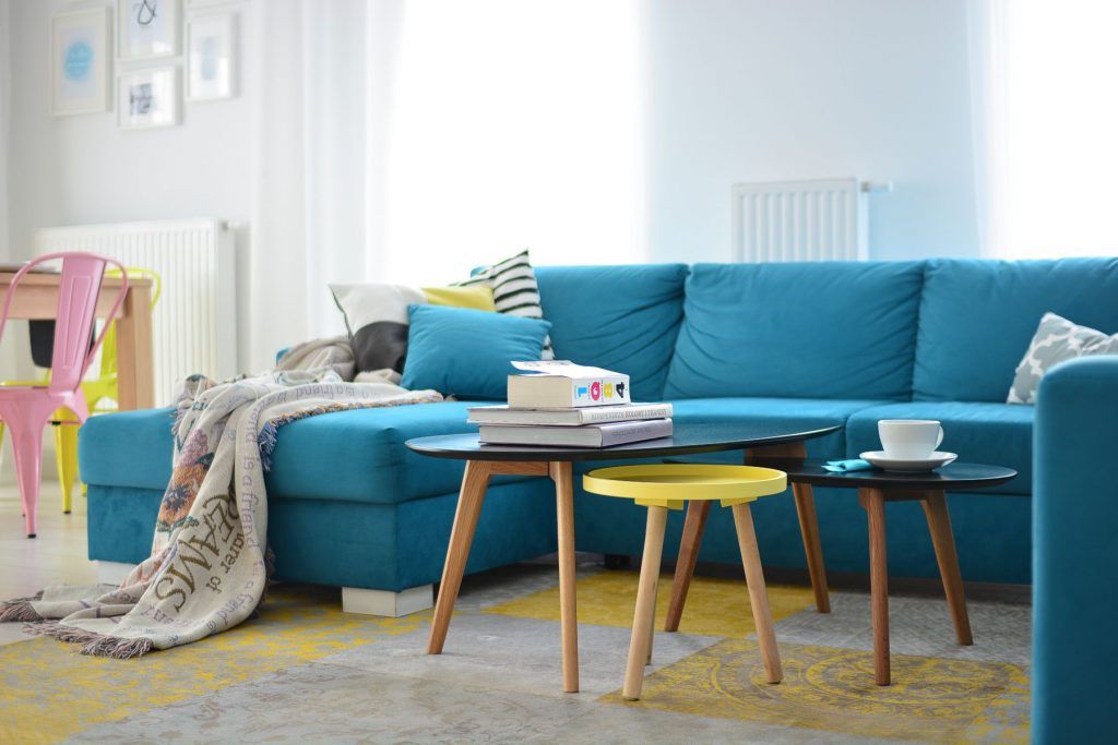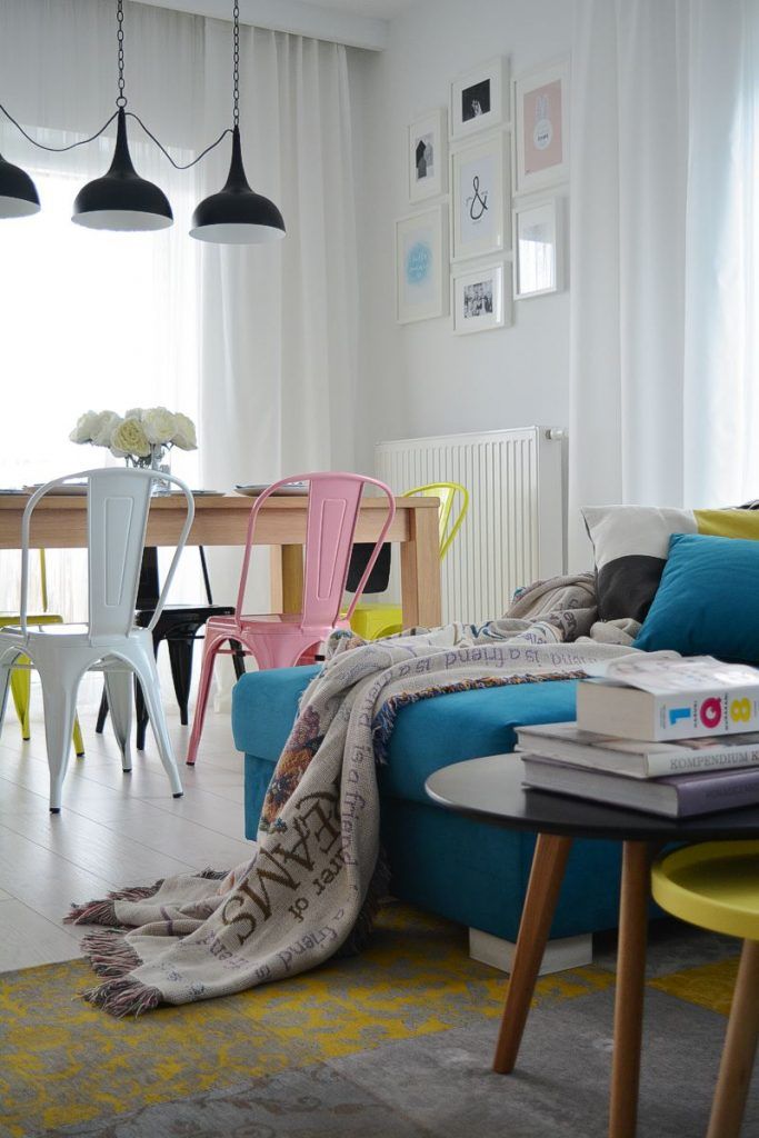 Pentru zona de living, canapeaua albastra este in centrul atentiei, atragand orice privire atat prin culoare, cat si prin designul modular. Intensitatea albastrului pare sporita pe fundalul alb, iar culorile din jur o completeaza minunat. Diversele tuse de galben, negru sau turcoaz vin sa accentueze piesele ce definesc functiunile, cum ar fi corpurile de iluminat negre suspendate deasupra mesei. Scaunele Tolix, fiecare in alta culoare pun in valoare acest spatiu al casei diningul.